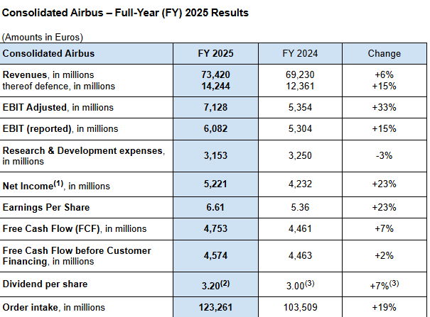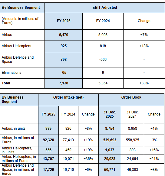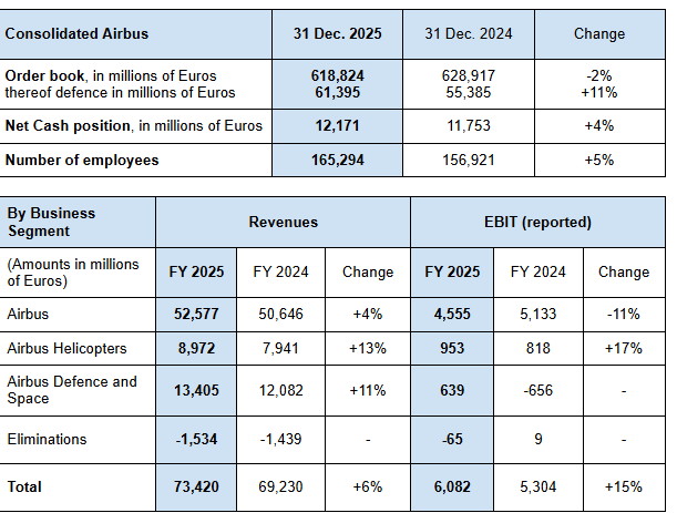 “2025 was a landmark year, characterised by very strong demand for our products and services across all businesses, a record financial performance, and strategic milestones. We successfully navigated a complex and dynamic operating environment to deliver on our updated guidance,” said Guillaume Faury, Airbus Chief Executive Officer. “Global demand for commercial aircraft underpins our ongoing production ramp-up, which we are managing while facing significant Pratt & Whitney engine shortages. The broad and competitive portfolios of Defence and Space as well as Helicopters allow us to capture the momentum in defence. We are also making progress to establish a new global industrial space player, together with our partners. These 2025 results and the confidence in our future financial performance support the proposed higher dividend payment.”