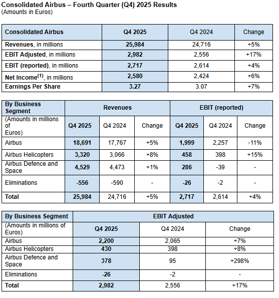 Amsterdam, the Netherlands, 19 February 2026 – Airbus SE (stock exchange symbol: AIR) reported consolidated Full-Year (FY) 2025 financial results and provided guidance for 2026.